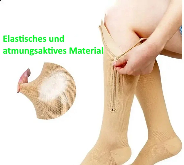Unsere Kompressionsstrümpfe bestehen aus elastischem, atmungsaktivem Material und sind mit einem hochwertigen Reißverschluss ausgestattet, der das Anziehen auch bei geschwollenen Waden erleichtert.